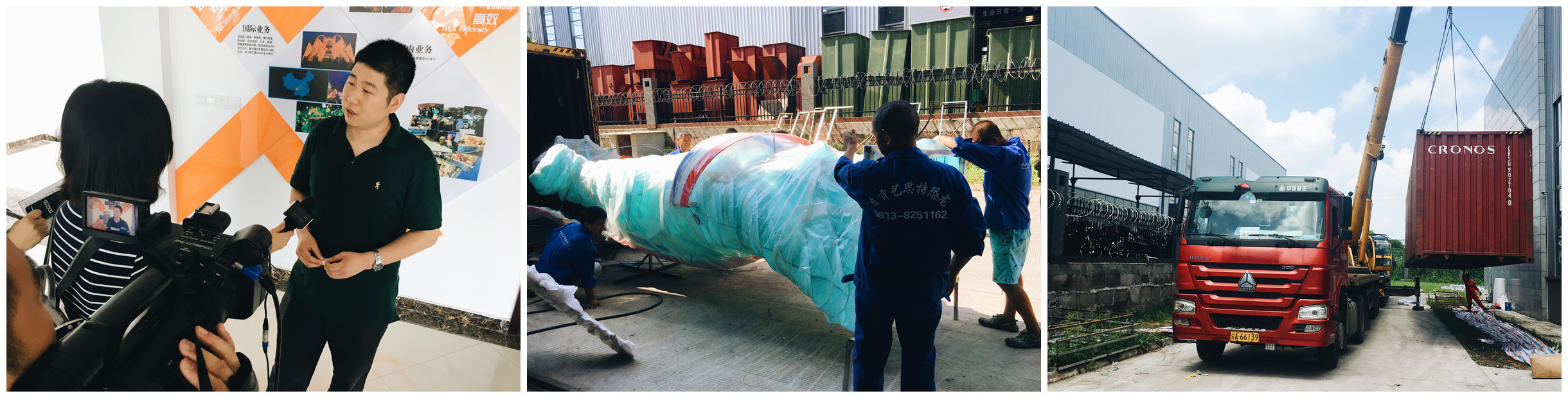 (自貢電視臺記者對自貢市燈貿(mào)集團(tuán)股份有限公司國韻公司總經(jīng)理李斌進(jìn)行采訪)       (工作人員對彩燈進(jìn)行裝箱)      (運輸車正在裝載集裝箱)