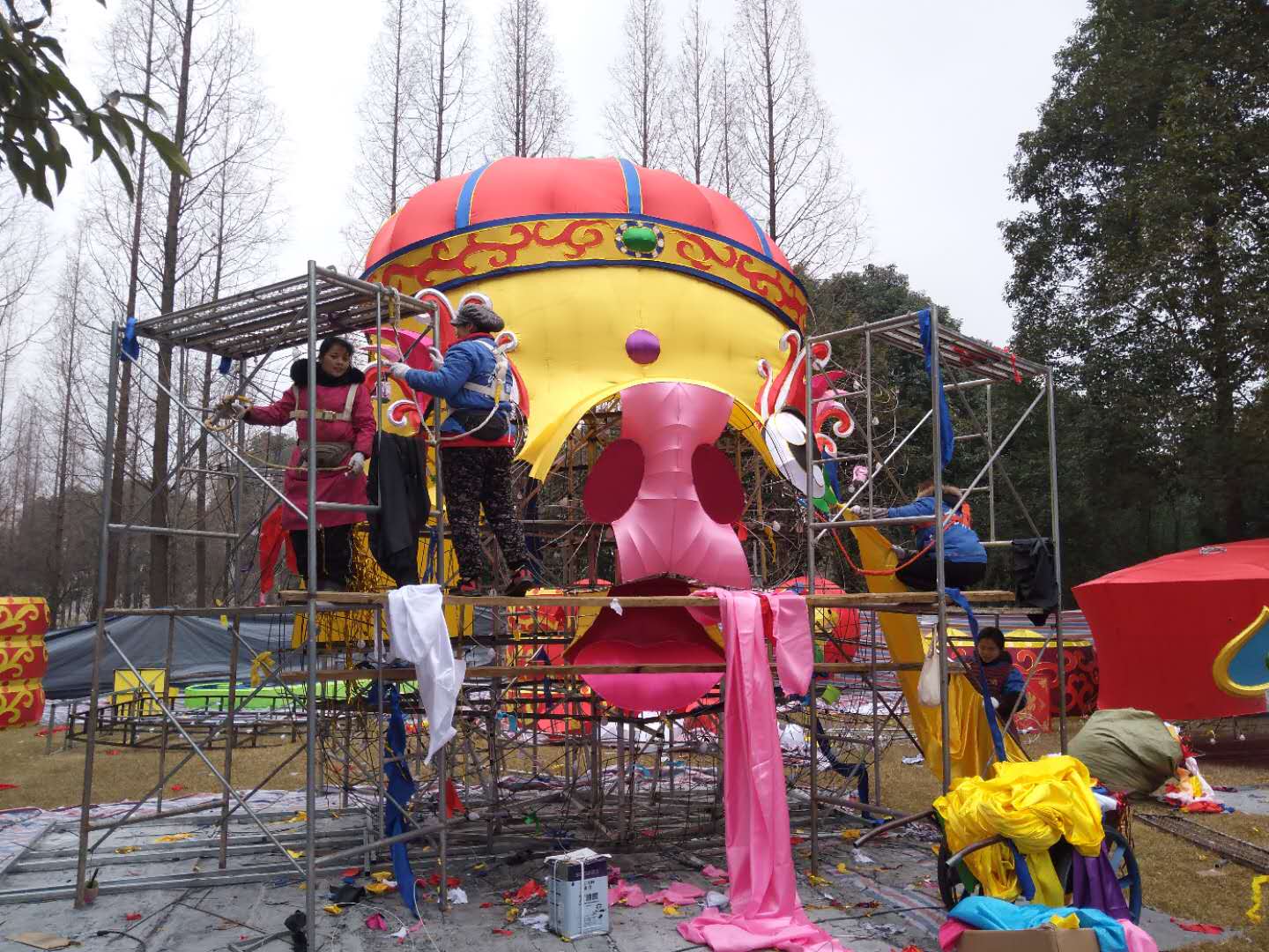 目前,東方彩燈身懷技藝的制燈匠人正緊鑼密鼓的制作中。那些看上去冰冷粗獷的鐵絲、綢緞,在他們“馴化”下變得溫順隨和,一組組或生動、或委婉、或雄渾的燈組栩栩如生。本屆“太陽節(jié)”較大的突破是所有燈組均采用節(jié)能環(huán)保燈具,較之往年減少三分之二的用電負(fù)荷,打造炫彩奪目的燈光效果的同時,保護(hù)了環(huán)境和游客。在制作方面,部分主要大型燈組均采用加密色丁布裝飾,傳統(tǒng)燈組結(jié)合現(xiàn)代科技,民俗風(fēng)情融合時尚藝術(shù),集現(xiàn)代感、藝術(shù)感為一體,凸顯顏色豐富的層次感。