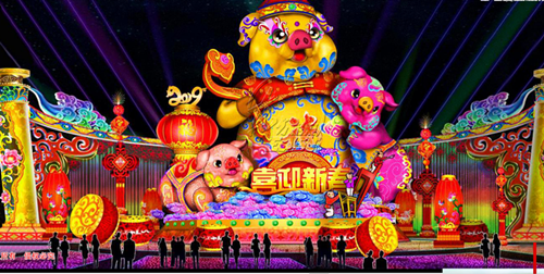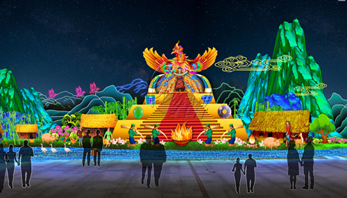 本屆太陽節(jié)以《太陽崇拜》、《玉米門神》等瑪雅諸神燈組,以及《夢幻森林》、《動物世界》里與瑪雅人息息相關(guān)的動物燈組,與《古蜀文明》、《古蜀生活》中古蜀人漁獵農(nóng)耕和祭祀相關(guān)的燈組交相輝映。園區(qū)氛圍營造也極具特色,瑪雅象形文字、古蜀紋飾等元素將帶領(lǐng)觀眾進(jìn)入兩大文明交匯的海洋。當(dāng)然,應(yīng)景的“年味兒”也必不可少,東方彩燈打造金沙節(jié)史上最大的立體生肖豬造型,向觀眾送上新年祝福。