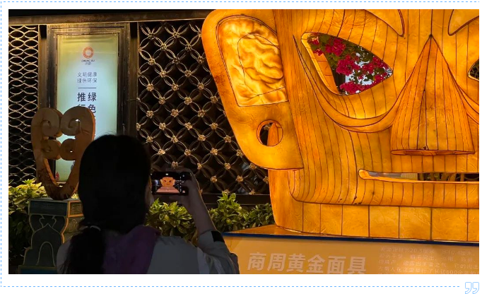 高仿真復原的古蜀文物造型燈組制作精美。在文物原件基礎上放大40倍制作而成的黃金面具燈組呈現(xiàn)出王者之氣的風范,青銅立人、小金面具、喇叭形金器等6件文物造型燈組環(huán)伺左右,立體呈現(xiàn)古蜀先民的高超智慧。