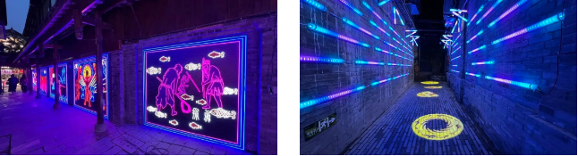 燈展還利用寬窄巷子獨特的建筑形式,在“寬徑”兩邊的墻壁上,用光雕、LED、互動投影等形式打造了長達80米的“時間長廊”。隨著游客參觀的腳步,古蜀人祭祀、漁獵、制陶、冶金、治玉等生活片段如連環(huán)畫般漸次出現(xiàn)。